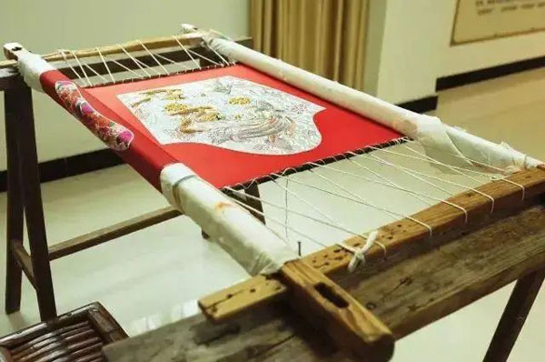 绒绣:在各种丝、绸、缎上,以平绣针法用丝绒绣出平的画面;题材多为飞禽、博古,用作画片、挂屏等。