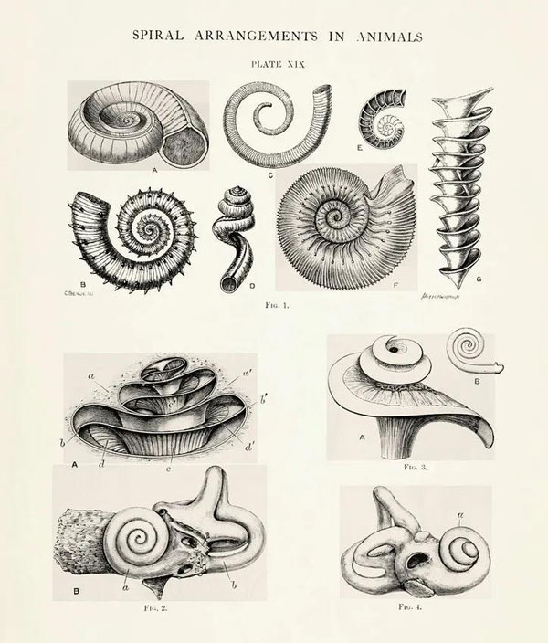 《自然中的设计》第一卷中的图版XIX,说明螺旋壳结构与内耳骨部分之间的相似之处 。 © archive.org